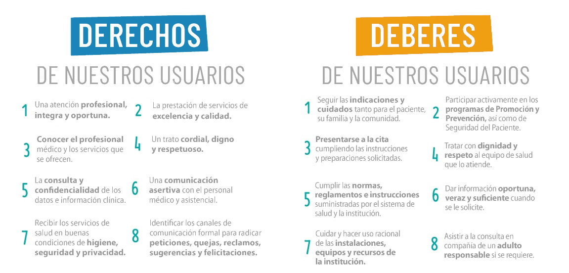 Por lo anterior, es imprescindible dar a conocer los Derechos y Deberes de los Usuarios consagrados en la Ley estatutaria 1751/15, donde se establecen las obligaciones de todos los agentes, usuarios y demás que intervengan de manera directa o indirecta en la garantía del derecho fundamental a la Salud, a todos los Clientes Internos y Externos.
